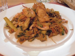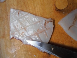 Tallam totes les verdures en juliana o en trossos llarguers. Tallam el brócoli en ramets més petits, el prebre coent en 4 trossos i els alls laminats de manera basta. Netejam els calamars i els obrim. Els tallam en trossos quadrats i feim incisions en diagonal però sense arribar a tallar-los del tot, tal i com es veu a la fotografia. D’aquesta manera rompem la fibra del peix i la cocció és més rà pida. Tallam els tentacles i reservam. Separam el cap de les gambes i guardam.