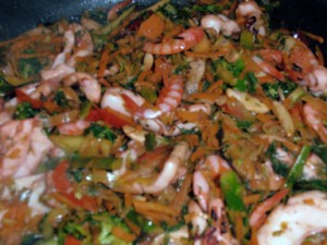 En una paella antiadherent hi posam un raig d’oli i quan sigui calent hi saltejam el cap de les gambes. Les retiram quan hagin tret el sabor i tot seguit hi saltejam les verdures en l’ordre en que estan descrites en els ingredients. Els alls els podeu posar quan hi afegiu els porros o els grells i el pebre coent també. Quan vos trobeu a punt d’acabar amb les verdures,  salpebrau i, en una paella a part, saltejau el calamar amb la pell de la llima ratllada i afegiu-lo a les verdures. Per acabar, afegiu les coes de les gambes, remenau bé, regau amb el suc de la llima i empolvorau-hi el fonoll picat. Tornau remenar i ja ho tendreu a punt. Avui la cà mera no tenia el seu dia i les fotos no han quedat massa bé. Tot i aixà esper que es vegi bé la idea. Bon profit!